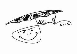 Cadeau de JackyDe retour chez lui, il m’offrit une réplique, à l’échelle 1:2, de son casque. J’en avais les larmes aux yeux tant l’émotion était grande. DedicaceIl accepta de dédicacer une photo réalisée par mon ami Popol et une reproduction de peinture réalisée par Benoit Deliege. Il me fit remarquer que sa signature sur la page d’accueil de ce site n’était plus d’actualité et il signa un feuille blanche (voir page d’accueil). Il réalisa également une signature amusante qu’il utilise parfois lorsqu’il écrit à un ami. La signature d’un Rain Master.